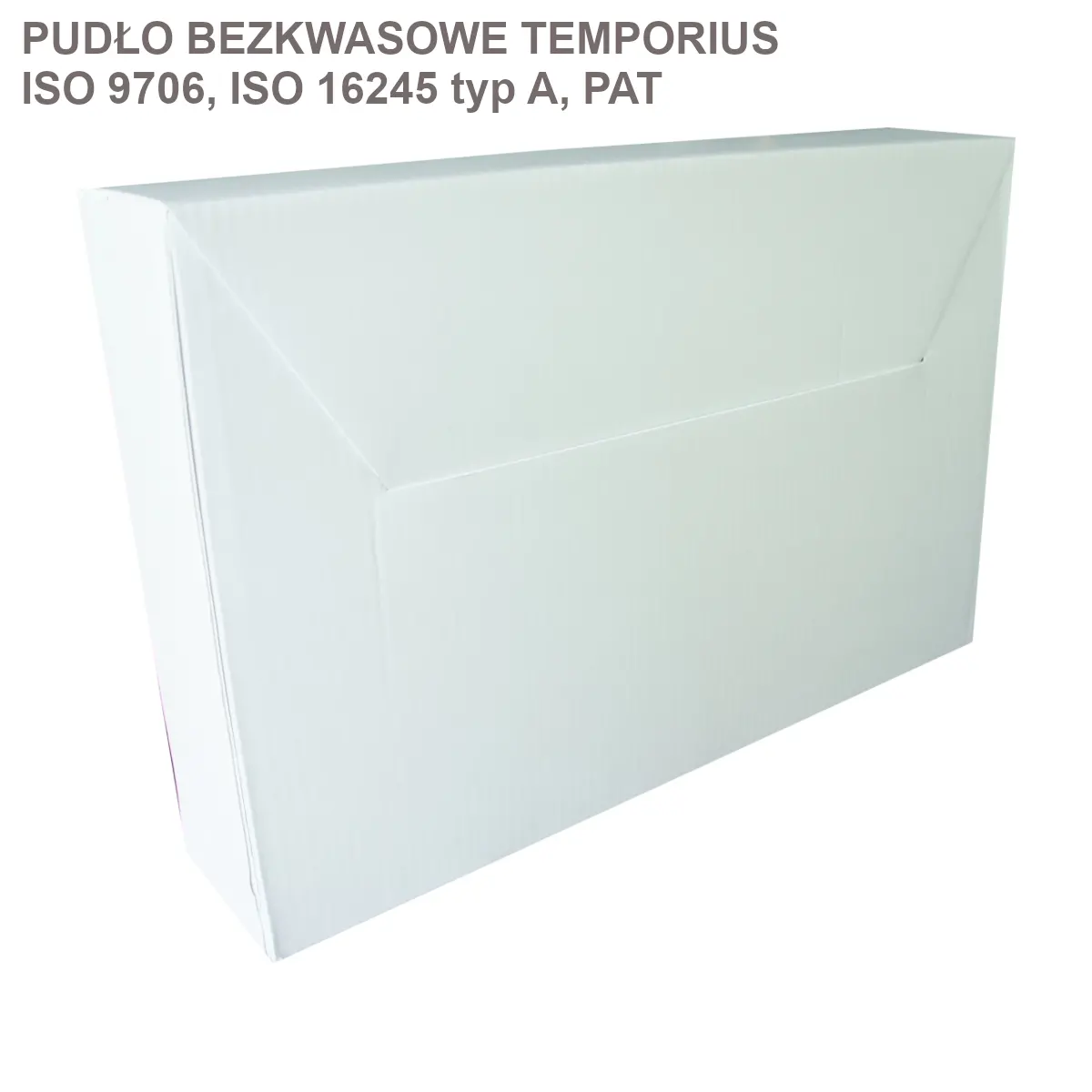 Materiał: bezkwasowa tektura falista 3 warstwowa certyfikat ISO 9706, ISO 16245 typ A, PAT